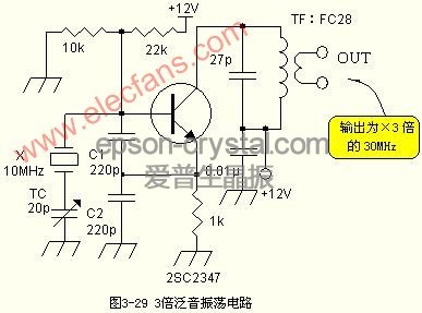 (此为利用无调整电路的高谐波成分,在输出的谐振电路取出3倍频的30MHz信号。)