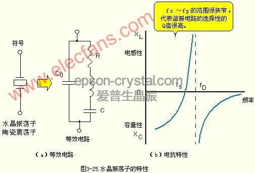 图(a)所示的为其等效电路,图(b)所示的为其电抗(Reaetance)特性。fs为串联谐振频率点fp为并联谐振频率点,其谐振频率分别如下: