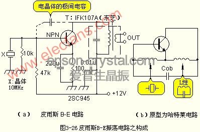 图26的电路称为皮尔斯B-E电路。其原型为图(b)的哈特莱振荡电路。哈特莱振荡电路的电容器为利用晶体管的集极-基极间电容量Cab。