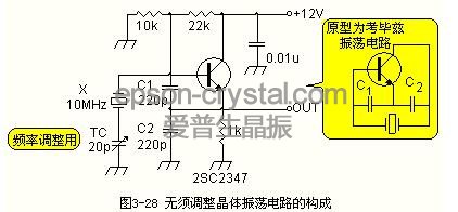 图28所示的为无调整晶体振荡电路。其原型为考毕兹振荡电路。