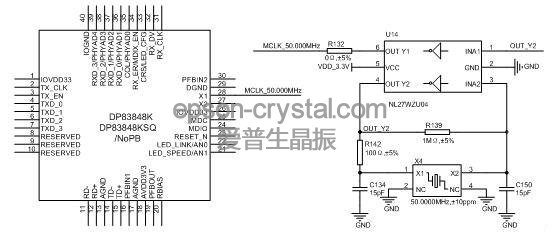 当客户M3352_YP做外围电路时,如需要使用百兆以太网功能,需要外加PHY电路,PHY芯片通??梢匝≡馜SZ8041或者DP83848,在使 用RMII接口时,无论选择何种型号的PHY芯片,都需要为PHY芯片提供一路50MHz的CLK信号。为了降低成本可以采用50.000M晶 体+NL27WZU04的方式为PHY提供50.000M的时钟源。
