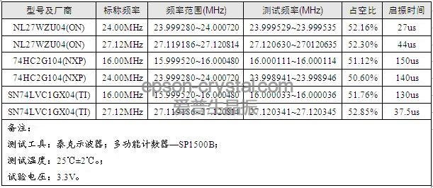 测试电路时,我们选用了三种不同频率的晶体(见表3)和三个厂家的无缓冲反相器进行组合测试,测试结果见表4.