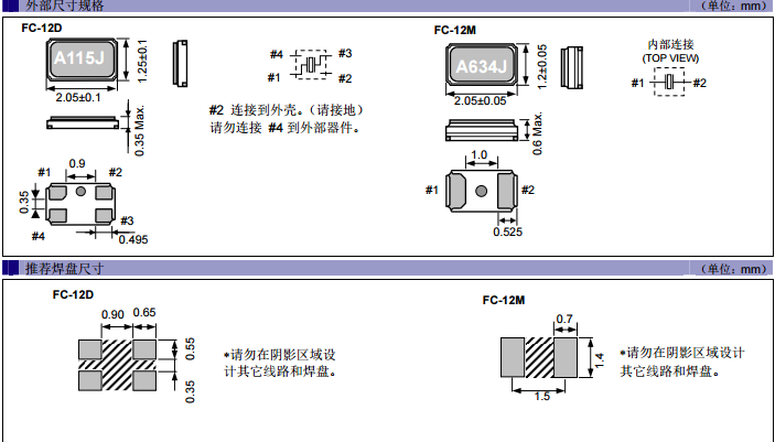 可以看出,FC12M与FC12D相比,FC12D比FC12M更薄,除了体积,我们可以看出FC-12D是两脚贴片晶振,而FC-12M是四脚晶振,所以这两者是否可以通用,也要看自身电路焊点是否可以通用,因为小尺寸,超薄的特点,所以FC-12D与FC-12M通常用在消费类产品如信用卡等产品中。
